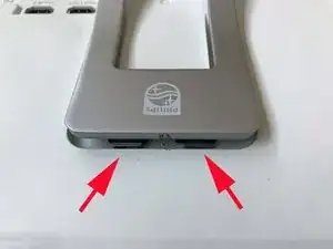 Для ее движения потребуется сила, нажмите на алюминиевую скобу в сторону подставки сабвуфера, чтобы освободить два зажима, удерживающие скобу на задней крышке.