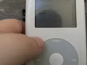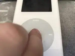 Удерживайте кнопку SELECT (средняя) и кнопку MENU, чтобы перезагрузить iPod.