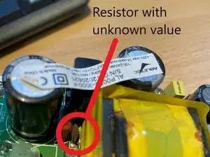 Проверив предохранитель и конденсаторы, я обнаружил на двух моих источниках питания (я купил второй неисправный для запчастей), что этот резистор сгорел или по крайней мере остался без оболочки.