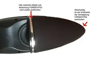 Используйте плоский пластиковый инструмент или тупой нож, чтобы ввести его в щель между хромированной планкой и защитой динамика, чтобы выдавить решетку, одновременно нажимая на пластиковый зажим с обратной стороны по краю. БУДЬТЕ ОСТОРОЖНЫ, зажимы могут легко сломаться. Затем аккуратно сдвиньте крышку вбок.