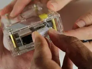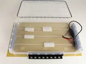 Разместите блок батарей на крючковой липучке внутри коробки.
