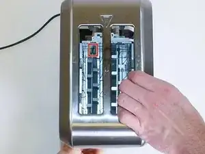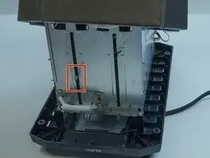 На задней стороне тостера (на стороне, противоположной стороне рычага тостера) будет видна болтающаяся сломанная скоба.