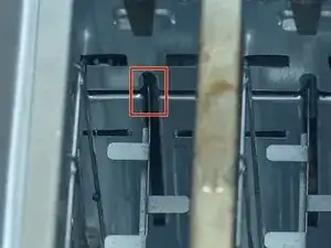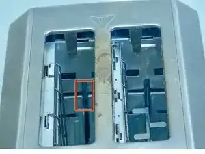 Загляните внутрь тостера и найдите два углубления, из которых отсоединилась опорная скоба.