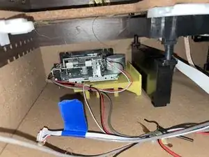 Снимите штекер питания. Это тоже довольно неприятно. Я использовал короткие плоскогубцы, чтобы сжать защёлку (но не слишком сильно) и пошевелить штекер, чтобы вытащить. Начинайте аккуратно и увеличивайте усилие, чтобы не деформировать и не сломать разъём. Если всё же повредите, можно временно зафиксировать провода стяжкой или термоклеем, как сделано в остальной части (но лучше не делать так).