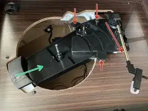Ослабьте фиксирующий винт (зелёный круг) как можно сильнее (заподлицо с платформой), чтобы было больше места для манёвра всего механизма.