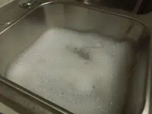 Убедитесь, что слив закрыт, чтобы вода не уходила. Для активации мыла размешайте воду рукой, пока заполняете раковину.