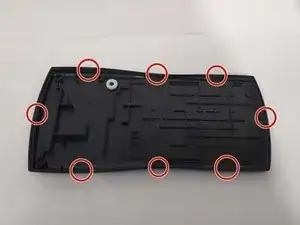 С помощью ножа, бритвы или другого точного режущего инструмента удалите верхнюю часть 10 пластиковых заклёпок, которые соединяют датчик клавиатуры с передней частью корпуса.