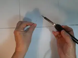 Возьмите паяльник доминирующей рукой и держите его как карандаш. Другой рукой возьмите припой и коснитесь им жала паяльника. Это расплавит небольшое количество припоя на жале.