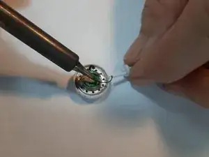 Крепко держите корпус наушника за ножку одной рукой и за динамик другой рукой. Аккуратно, но решительно примените поддевание, чтобы отделить корпус от динамика.