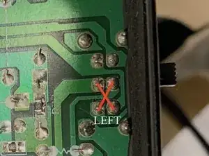 Контактные точки, над которыми нам нужно работать, находятся на нижних 4 контактах в группе из 6 контактов, прямо слева от переключателя, на задней стороне печатной платы.