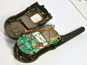 Не прикасайтесь к контактным площадкам кнопок на плате (контактные площадки показаны в красной рамке на втором изображении). Это может вызвать долгосрочное повреждение радиостанции, если их не очистить должным образом (см. Ремонт контактных площадок кнопок Motorola TALKABOUT FV700).