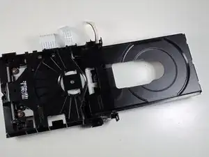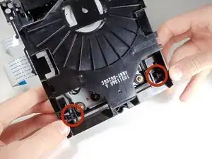 Пальцами отведите показанные защёлки к бокам лотка, освобождая внутренний лоток с лазером.
