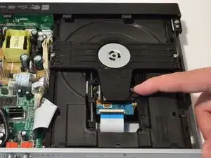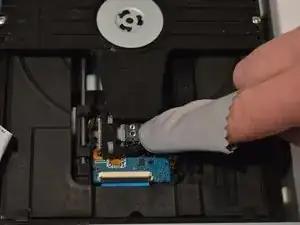 Чтобы получить доступ к оптической линзе, отведите оптический привод назад, как показано на изображениях, находящихся на двух металлических направляющих.