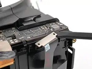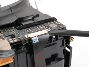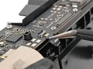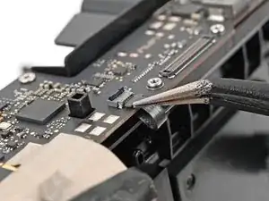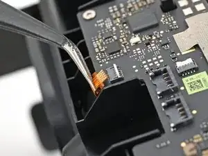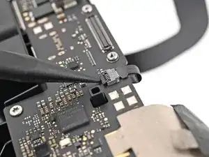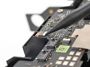 Используйте жало лопатки или чистый ноготь, чтобы откинуть фиксирующую планку ZIF-разъёма микрофона на дочерней плате.