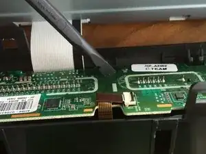 Возьмите лопатку и поднимите маленькую чёрную защёлку на белом разъёме, куда подключена коричневая лента сенсорного управления.