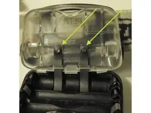 Это самый важный шаг. НЕ пытайтесь освободить защелки спереди. Вставьте маленькую отвертку в указанные места сзади рядом с "петлями ремня", чтобы отогнуть заднюю часть корпуса и освободить защелки внутренней части.