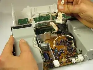 Будьте осторожны при подъёме нижней пластины; с её нижней стороны подключён короткий бело-оранжевый 4-контактный разъём.