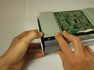 Двумя руками отведите боковую панель корпуса от устройства, одновременно поднимая плату и сборку динамиков прямо вверх.