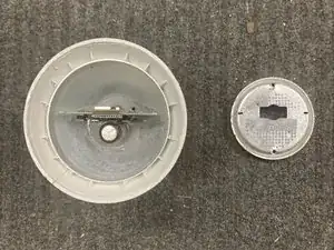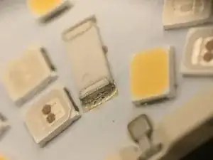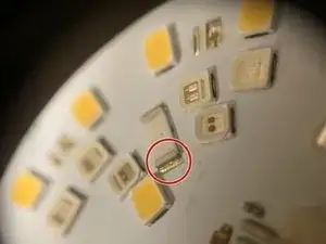 После завершения Шага 1 Руководства по разборке получите доступ к белой печатной плате и проверьте состояние двух резисторов, у которых могут быть поврежденные места пайки. Это руководство показывает, как отремонтировать эти два треснувших резистора и вернуть лампе нормальное функционирование.