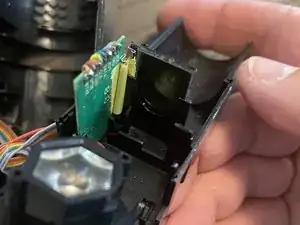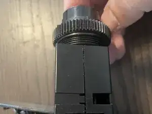 Потяните за проекционный узел, чтобы отсоединить его от корпуса. Верхняя часть, содержащая линзу, отсоединяется рукой, нижняя имеет 3 зажима и гайку, которая её фиксирует.
