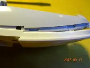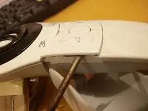 Отделите верхнюю белую пластиковую часть от нижней серой пластиковоъ основы, поддев между двумя слоями острой отверткой. Услышите встревоживающие щелчки по мере освобождения пластиковых защелок и разделения деталей.