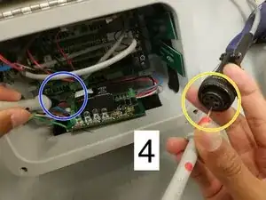 4. Поместите один провод в одно из отверстий разъема автосамплера (желтый круг).