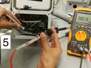 2. Чтобы убедиться, что вы находитесь на настройке тестирования шума, коснитесь вместе красного и черного проводов (желтый круг). Вы должны услышать звук.