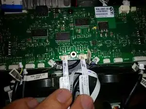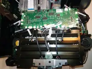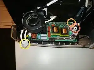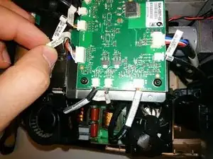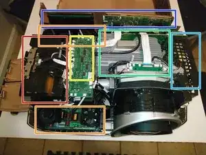 Начиная от большого ленточного кабеля ZIF и перечисляя по часовой стрелке, у нас: ленточный кабель платы ввода/вывода, DC POWER IO, Fan Main, IR, Fan Ctrl VDI, Fan Lamp Driver, [вентилятор обдува лампы], Temp Lamp, Lamp Memory, Lamp 2 (переключатель), CW2, ленточный кабель цветового диска 2, ленточный кабель цветового диска 1, CW1, Lamp 1, Lamp Memory, Temp Out, [вентилятор обдува лампы 1], Fan Lamp Driver, LMP Ctrl VDI, IR2