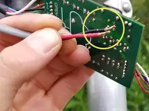 Затем, взяв зелёный разъём, вытяните батарейный разъём из контроллера заряда солнечной панели (синяя стрелка).