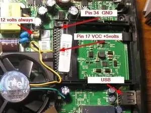Поскольку мне не нужен слот PC Card (оплата ТВ и т.п.), а нужен USB, я выбрал контакты 17 и 34 слота PC Card (VCC и GND) для получения 5 вольт (пожалуйста, проверьте правильность выбора контактов мультиметром!)