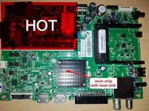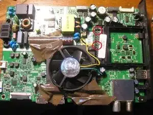 Тем не менее, после разборки корпуса я обнаружил, что без задней крышки телевизор работал заметно дольше (>1 часа), прежде чем окончательно выключиться. Значит, я предположил, что это действительно тепловая проблема. В конце концов мне удалось решить её простым добавлением старого процессорного вентилятора.