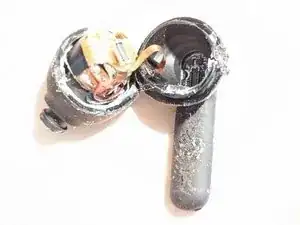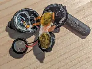 В центре наушника находятся материнская плата, крупная батарея и пластиковая чашка, которая, вероятно, влияет на акустику, но будучи приклеенной, никогда не вернётся точно на своё место.