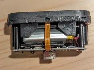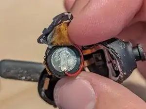 При поддёве сердцевины мы наконец видим то, что не приклеено. Батарея — литий‑полимерная 1054, припаяна на месте. При условии, что вы каким‑то образом дошли до этого этапа, перепайка старой батареи и установка новой вполне осуществимы.