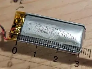 На батарее выгравировано WG 111635, стандартные 3.7V, 2.22Wh, 600mAh, 210601 (вероятно серийный номер). Размер батареи 3x1.4x1 см, её легко заменить.