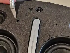 После снятия передней крышки аккуратно поднимите тонкий защитный слой, чтобы найти отверстия, в которых находятся винты. Чтобы найти два средних винта, вам потребуется сделать два небольших надреза, как показано на изображении.