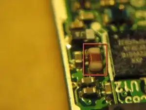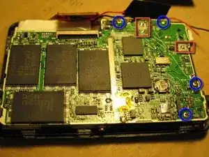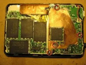 В идеале сначала нужно отключить батарею. К сожалению, провода батареи припаяны к плате под RF-экраном. Первый шаг — снять экран. Он припаян к основной плате в 4 местах, отмеченных красным.