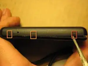 Освободите остальные две защёлки (отмечены оранжевым) аналогичным способом. Они находятся на 0,5" и 1,3" от стороны с USB-портом. НЕ ПЫТАЙТЕСЬ ОТДЕЛИТЬ СТОРОНУ С USB-ПОРТОМ. Эта сторона удерживается другими защёлками, поэтому сначала нужно освободить три другие стороны.