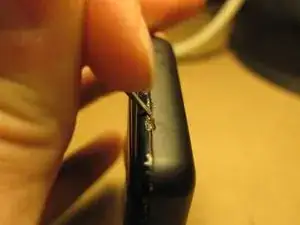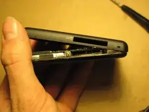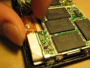 Теперь откроем разъём LCD. Чёрный прямоугольник на ПРОТИВОПОЛОЖНОЙ стороне лентового кабеля откидывается вверх, поворачиваясь в средней части разъёма. Используйте ноготь, чтобы аккуратно откинуть его вверх, затем выньте шлейф.