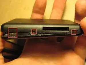 На фото 3 видны горизонтальные штифты (красные кружки), которые удерживают сторону корпуса с USB-портом. Именно поэтому мы открываем корпус с трёх сторон и сдвигаем его.