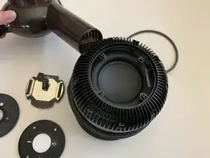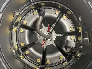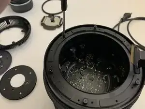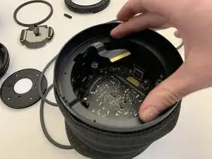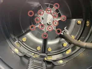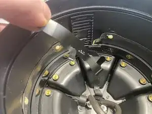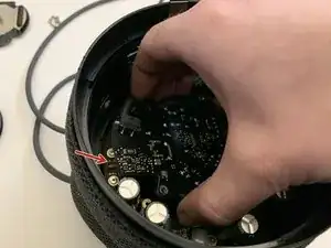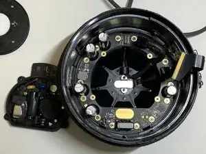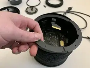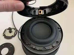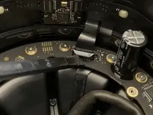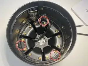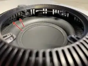 Выкрутите четыре винта T6, крепящие опорный диск сенсорной поверхности к крышке, и сдвиньте тканевую накидку с трёхмерной сеткой вниз.