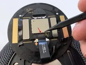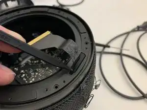 Осторожно отклейте ленточный кабель от стенки HomePod. Следите, чтобы не порвать этот кабель.