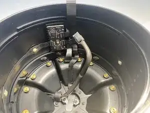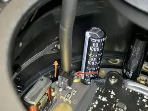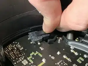 Другой рукой залезьте внутрь и нажмите на язычок разъёма, затем потяните прямо вверх, чтобы отключить динамик от платы усилителя.