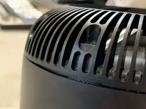 Включите фен на максимальную температуру и, как показано на изображении, обработайте периметр корпуса сразу под стыком верхней части и основного корпуса.