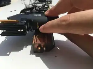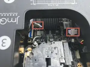 Аккуратно приподнимите вентилятор. Осторожно: он всё ещё подключён к проектору.