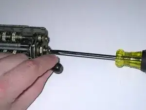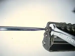 Возьмите что‑то острое, например маленькую отвёртку, и вставьте её в отверстие на левой стороне каретки, которое открылось после снятия винта.
