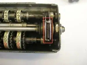 С левой стороны каретки кулачки на верхних и нижних дисках перемещают рычаг центрального вала обнуления. В результате выступы на валу обнуления перемещаются так, что при вращении верхнего или нижнего вала колёса останавливаются, когда показывают ноль.
