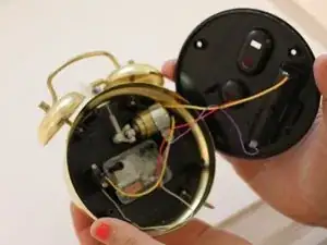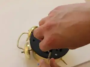 После откручивания винта от пластикового штифта будильника извлеките звонок, протянув его через нижнюю часть верхнего овального отверстия, расположенного на верхней части будильника.