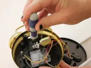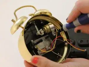 Используя маленькую отвёртку, открутите серебристый винт, расположенный в белом пластиковом штифте справа от соленоида, и извлеките ударник снизу овального отверстия, находящегося на верхней части будильника.