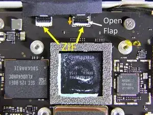 ZIF-разъём показан на втором изображении. Для подъёма фиксирующей планки следует использовать лопатку, как показано красной стрелкой.