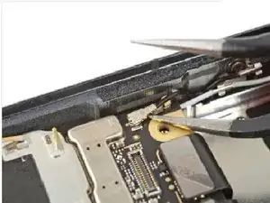 Отключите боковую антенну Wi‑Fi. См. шаг 5 руководства RDCC. Чтобы отсоединить разъём, подденьте тонким антистатическим инструментом или пинцетом металлическую шейку разъёма и поднимите его прямо вверх от платы.